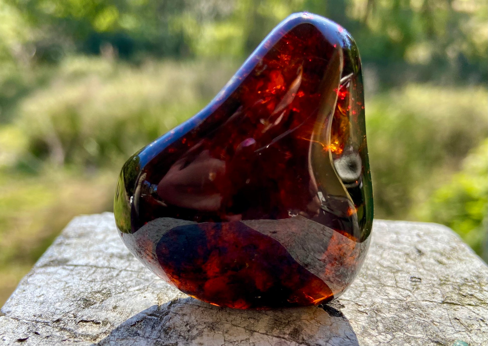 Ignite your inner fire with this extremely rare Red Fire Amber from the ancient shores of the Baltic Sea. With only 2 out of every 100 amber pieces naturally forming in red, this is a treasure of both geological rarity and spiritual potency. Polished to reveal its fiery glow, this specimen contains ancient organic inclusions—plant matter, bugs, and fragments of the primordial forest—preserved for millions of years within solidified sunlight.