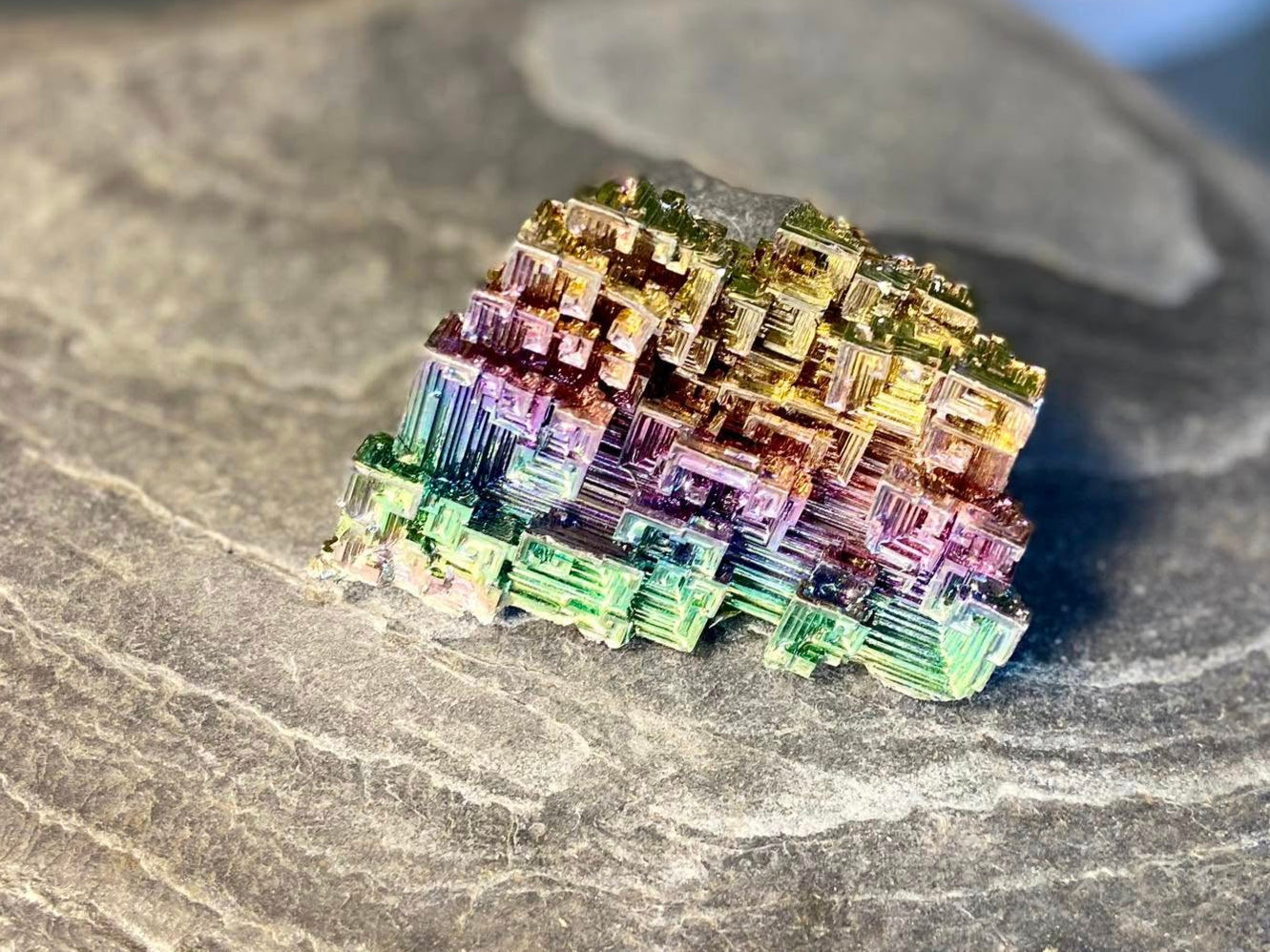 Exquisite and rare Bismuth boasts a rarely-seen silvery hue, crystalline and brittle in its natural state. More commonly, a gorgeous, rainbow-hued crystal is acquired as a result of the mining and refining of gold, copper, lead, silver, and tin. Historically, rainbow Bismuth has been used to ease one through transitions, bestow a sense of serenity, and enhance one's energy levels, preparing them to confront any changes and transmutations.